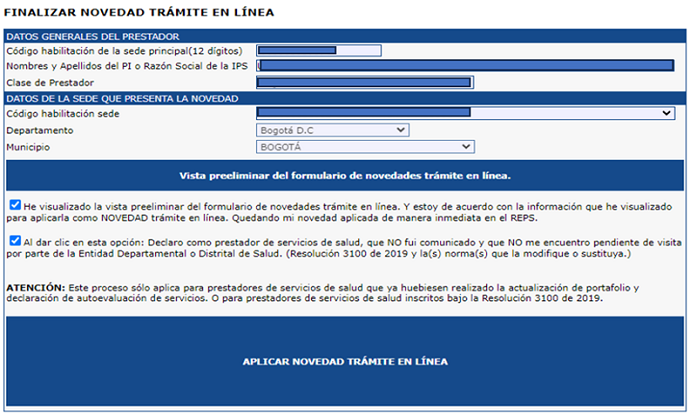 Cuando se trate de novedades en línea, el registro de la novedad queda aplicada de manera inmediata en el REPS una vez diligencie la novedad correspondiente, grabe la información, verifique el correcto diligenciamiento del formulario e ingrese al menú “Finalizar novedad trámite en línea” chequee las casillas y seleccione